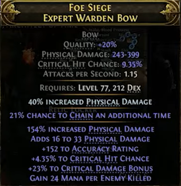 물리피해가 높은 좋은 활을 구하지 못했다면, 유니크 활인 죽음의 하프를 사용할 수 있다. - 3엑잘 정도에 구입이 가능하며, 투사체가 4개 추가되기는 옵션이 유용하다. 엔드게임용 좋은 활과는 데미지 차이가 나지만, 뼈 폭풍으로 많은 물리피해 버프를 받을 수 있기 때문에, 좋은 활을 구할때까지 사용할 수 있다.