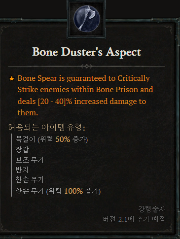 [강령술사 위상2]![]() 뼈 창은 뼈 감옥 내의 적에게 치명타를 가하며, 적에게 입히는 피해가 [20~40]% 증가합니다. |