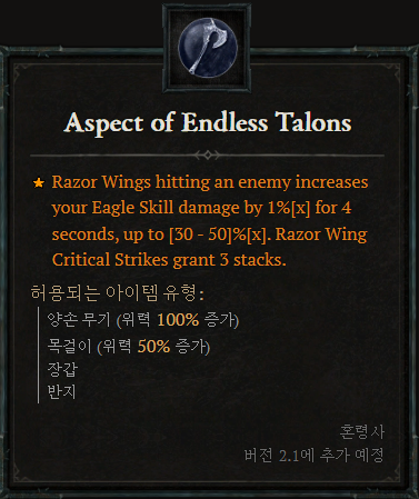 [혼령사 위상]![]() 서슬 날개가 적에게 적중하면 4초 동안 독수리 기술의 피해량이 1%[x] 증가하고, 최대 [30~50]%[x] 증가합니다. 서슬 날개 치명타는 3개의 스택을 부여합니다. |