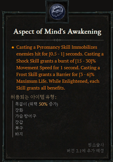방화 가술을 시전하면 적중당한 적을 [0.5~1]초 동안 이동불가로 만듭니다. 감전 기술을 시전하면 1초 동안 이동 속도가 [15~30]% 증가합니다. 서리 기술을 시전하면 최대 생명력의 [3~6]%만큼 보호막을 얻습니다. 깨우침 상태일 때 각 스킬은 모든 이점을 제공합니다. |