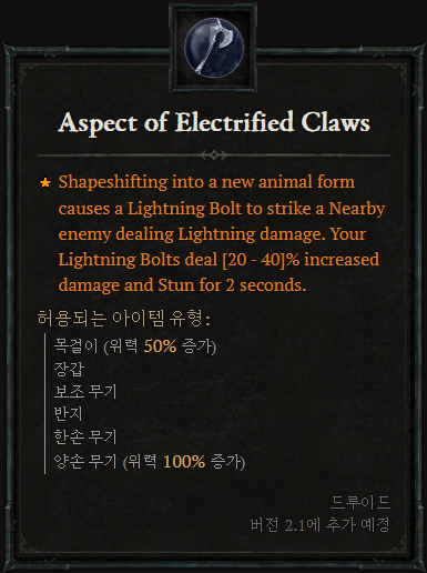 [드루이드 위상2]![]() 새로운 동물 형태로 변신하면 근처의 적에게 번개 화살이 날아가 번개 피해를 입힙니다. 번개 화살의 피해가 [20~40]% 증가하고 2초 동안 기절시킵니다. |