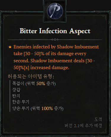 [도적 위상2]![]() 엄흑 주입에 감염된 적은 매초 [30~50]%의 피해를 입습니다. 암흑 주입의 피해는 [30~50]%[x] 증가합니다. |