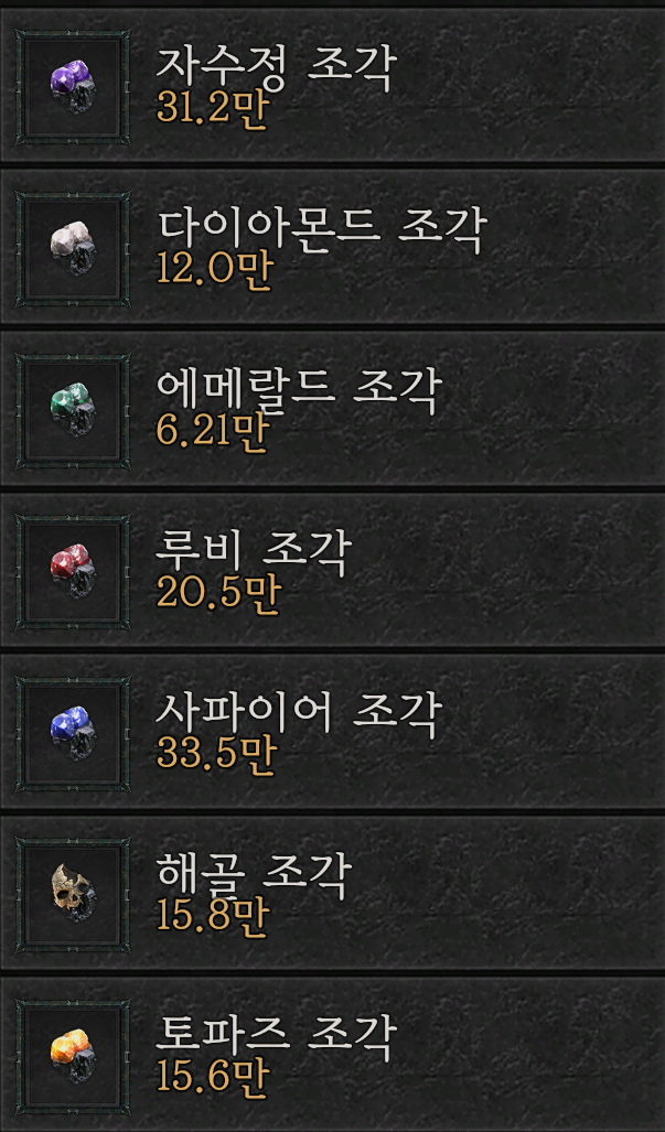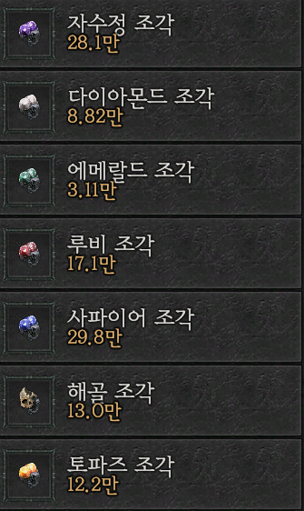 각 종류별 보석이 평균 만개 정도씩 늘었네요. 총 보석조각 7만개 정도 모인것 같습니다.