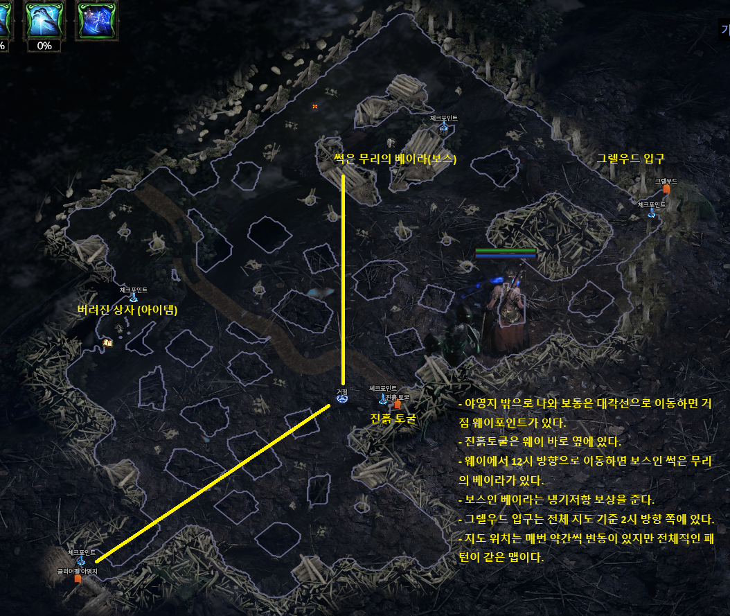 - 중앙쪽의 웨이포인트를 먼저 찾으면 바로 옆에 진흙토굴이 있고, 웨이 12시 방향으로 이동하면 보스 베이라가 있습니다. 그리고 다음 지역인 그렐우드는 2시 방향에 입구가 있습니다.