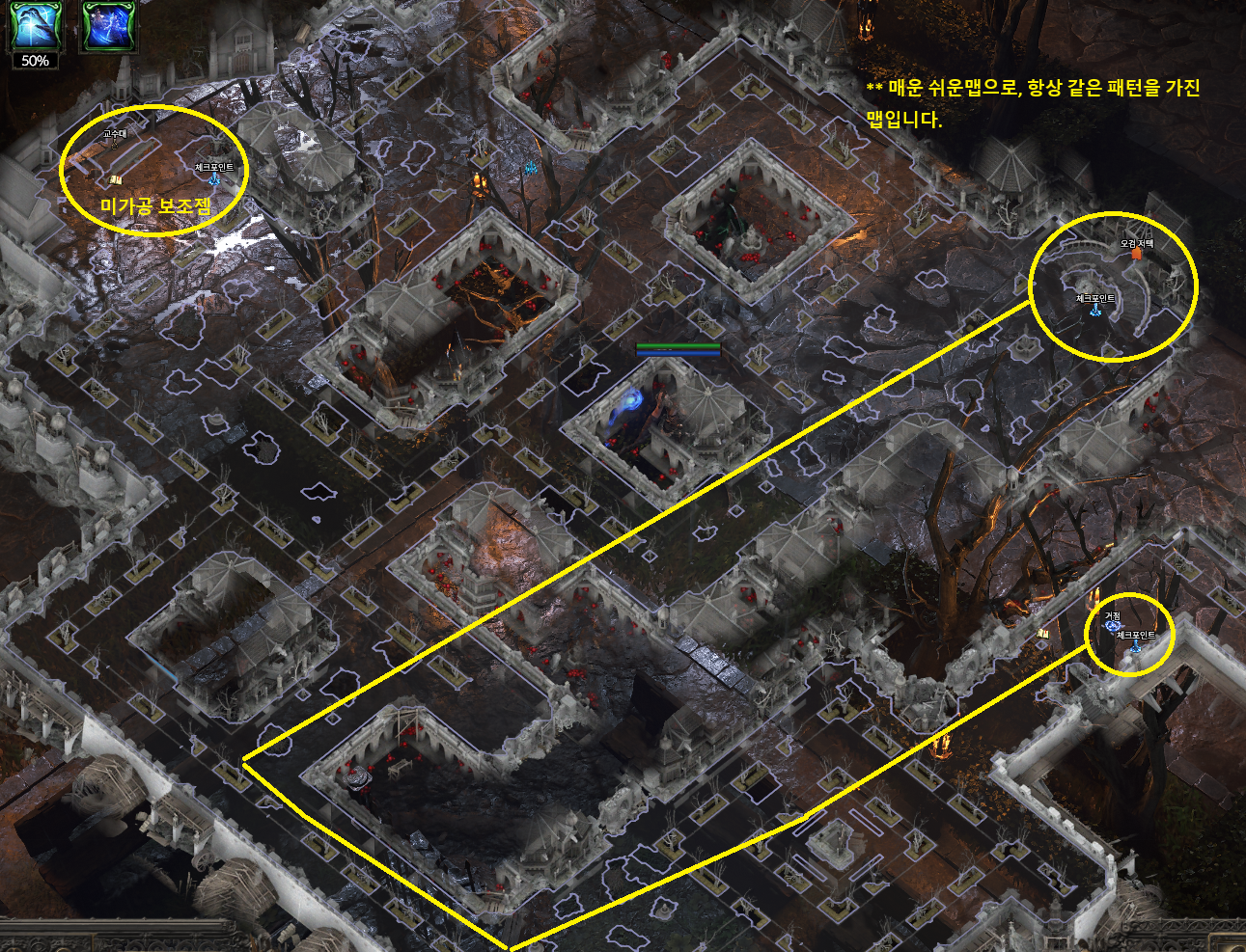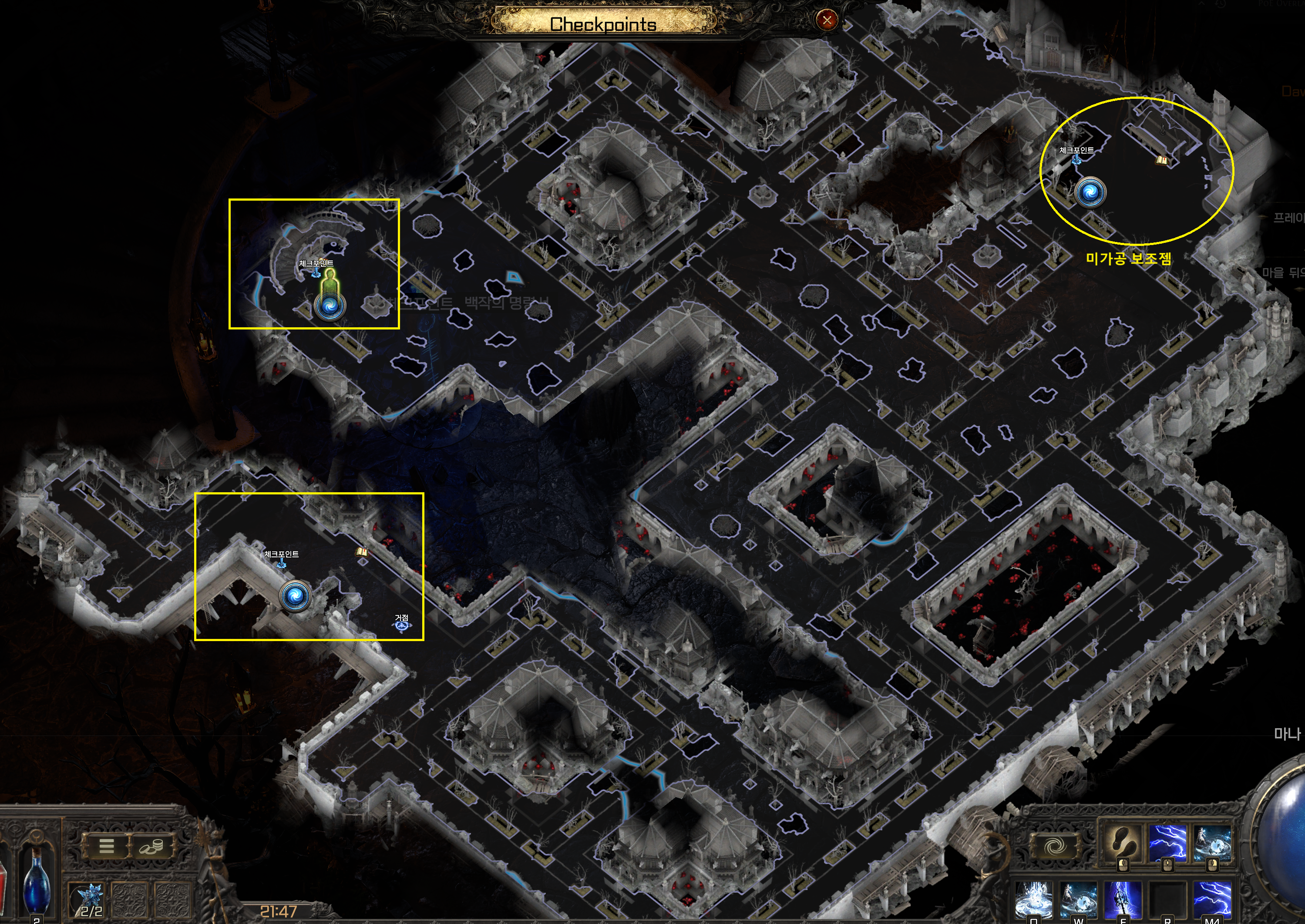 POE2 (Path Of Exile 2)/POE2 정보. [POE2: 지도정보] " 액트1 - 저택 성벽 지역 지도, 패턴, 길찾기 정보. by 먀아 2025. 4. 2. 반응형 - 액트1 저택 성벽 길찾기. - 항상 같은 패턴의 맵으로, " ㄷ " 자 모양으로 이동하면 북쪽에 저택 입구가 있습니다. (북동쪽 또는 반대 패턴일 경우 북서쪽) - 교수대의 경우 시체를 클릭하면, 미가공 보조젬을 얻을 수 있습니다. (교수대는 북서쪽 벽이나, 남서쪽 벽에서 발견할 수 있습니다. - 저택 성벽 지도. [0.2] 좌우 반전 된 패턴 반응형 공유하기 게시글 관리 My Favorite 저작자표시 비영리 변경금지 (새창열림) 관련글 [POE2: 지도정보] " 액트2 - 바스티리 외곽 지역 지도, 패턴, 길찾기 정보. [POE2: 지도정보] " 액트1 - 오검 저택 지역 지도, 패턴, 길찾기 정보. [POE2: 지도정보] " 액트1 - 오검 마을 지역 지도, 패턴, 길찾기 정보. [POE2: 지도정보] " 액트1 - 오검 농지 지역 지도, 패턴, 길찾기 정보.
