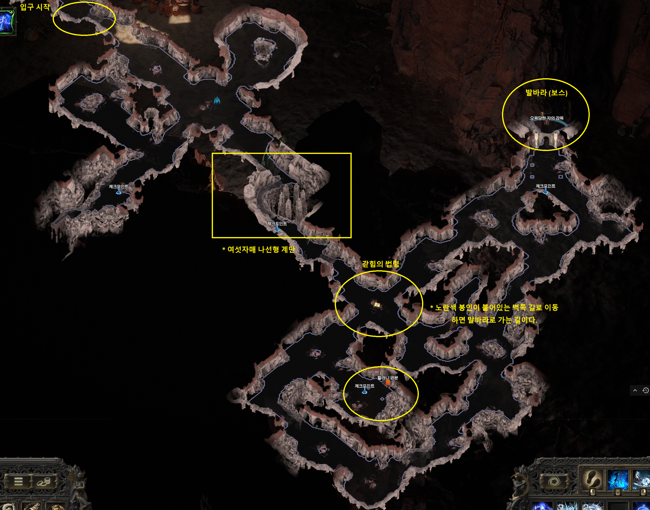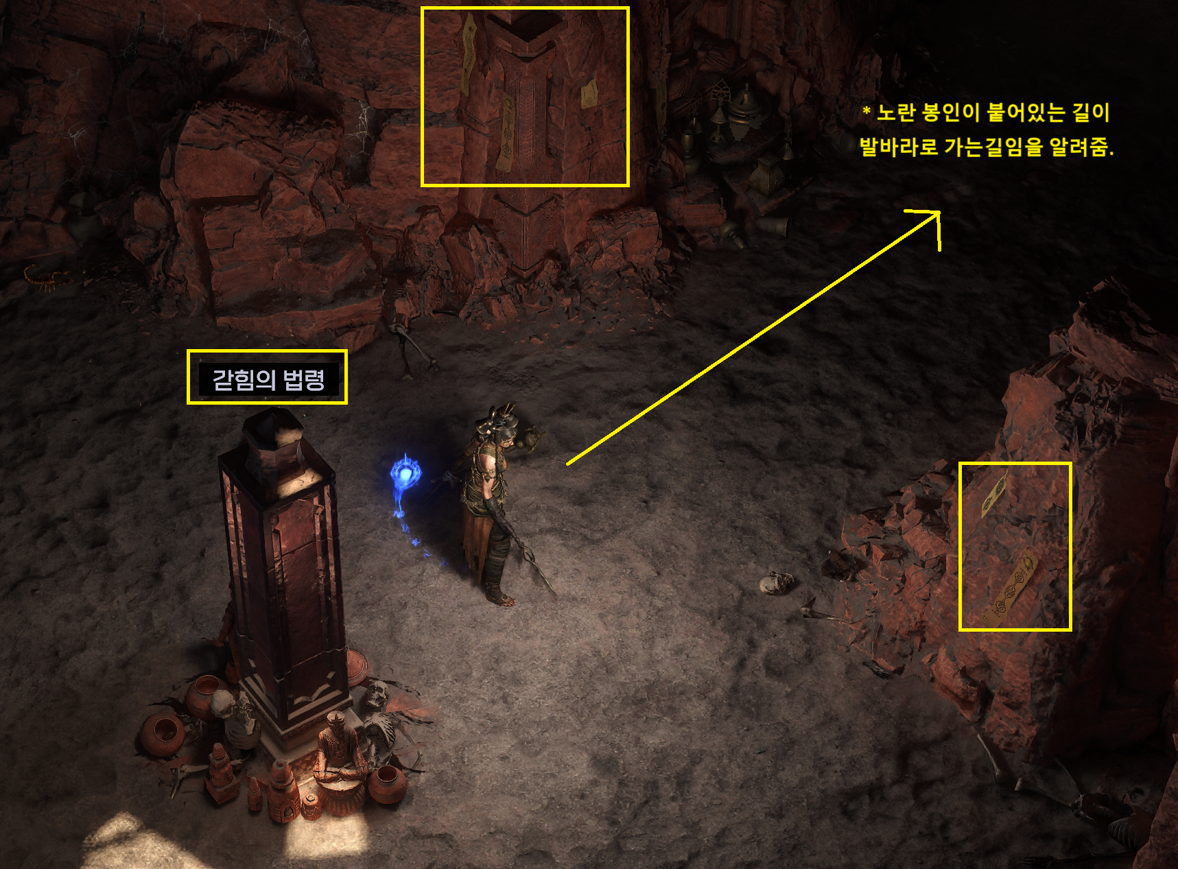 - 일정 패턴으로는 갇힘의 법령이라는 책이 있는 기둥이 맵 중앙쪽에 위치해 있는데, 이 기둥을 찾았다면, 주위 벽에 노란색 봉인이 붙어있는 쪽을 찾아 이동하면 발바라로 가는 방향이라는 것입니다. 다른쪽은 할라니 관문으로 이어지는 길입니다.