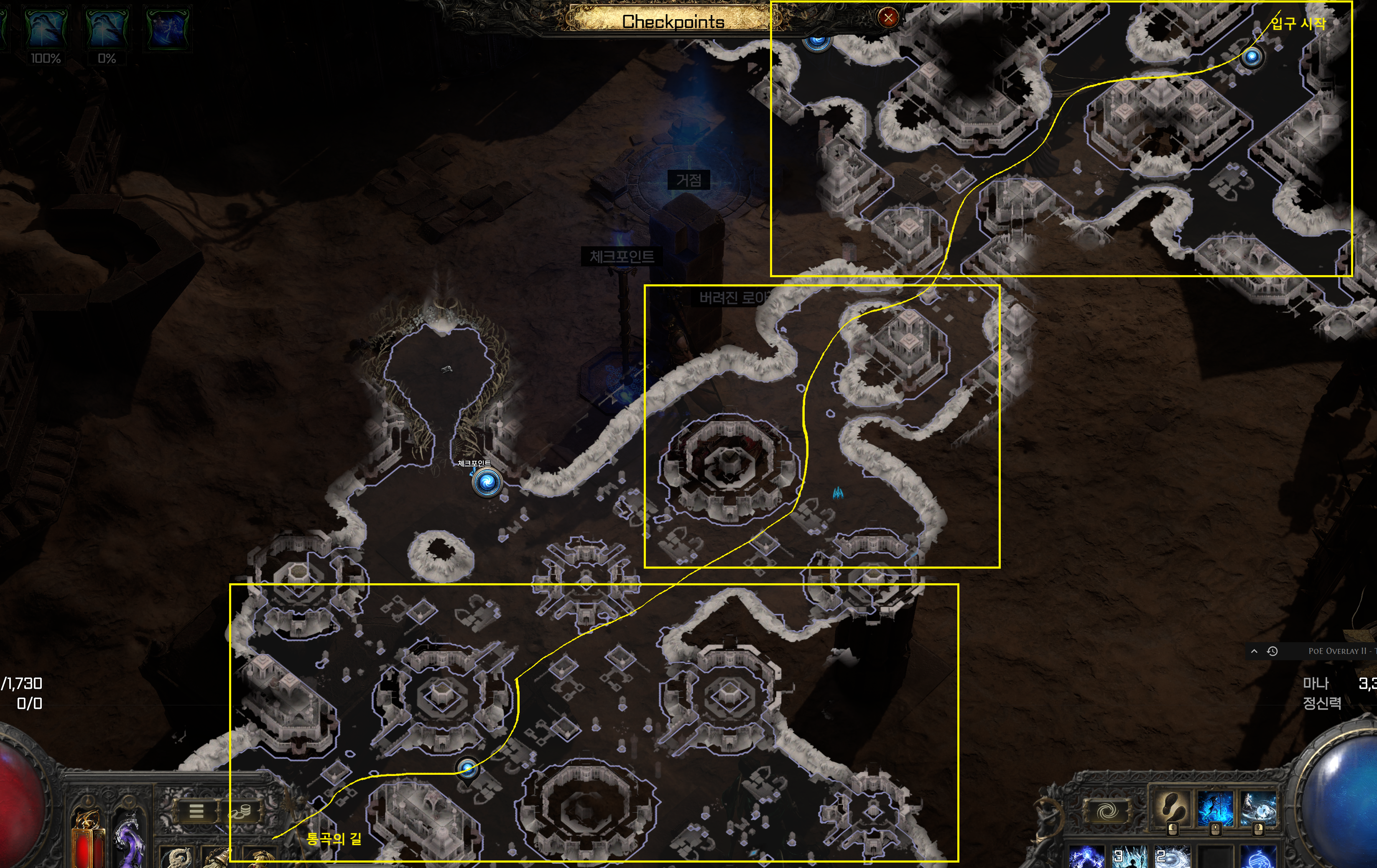 : 입구에서 가까운쪽 사각형 모양으로 초반 지역을 지나 가운데 비교적 좁은 구역을 지나면, 가장 면적이 넓은 마지막 구역이 나옵니다. 입구 반대편 쪽으로 쭉 간다고 생각하고 이동하면, 통곡의 길을 쉽게 찾을 수 있습니다.