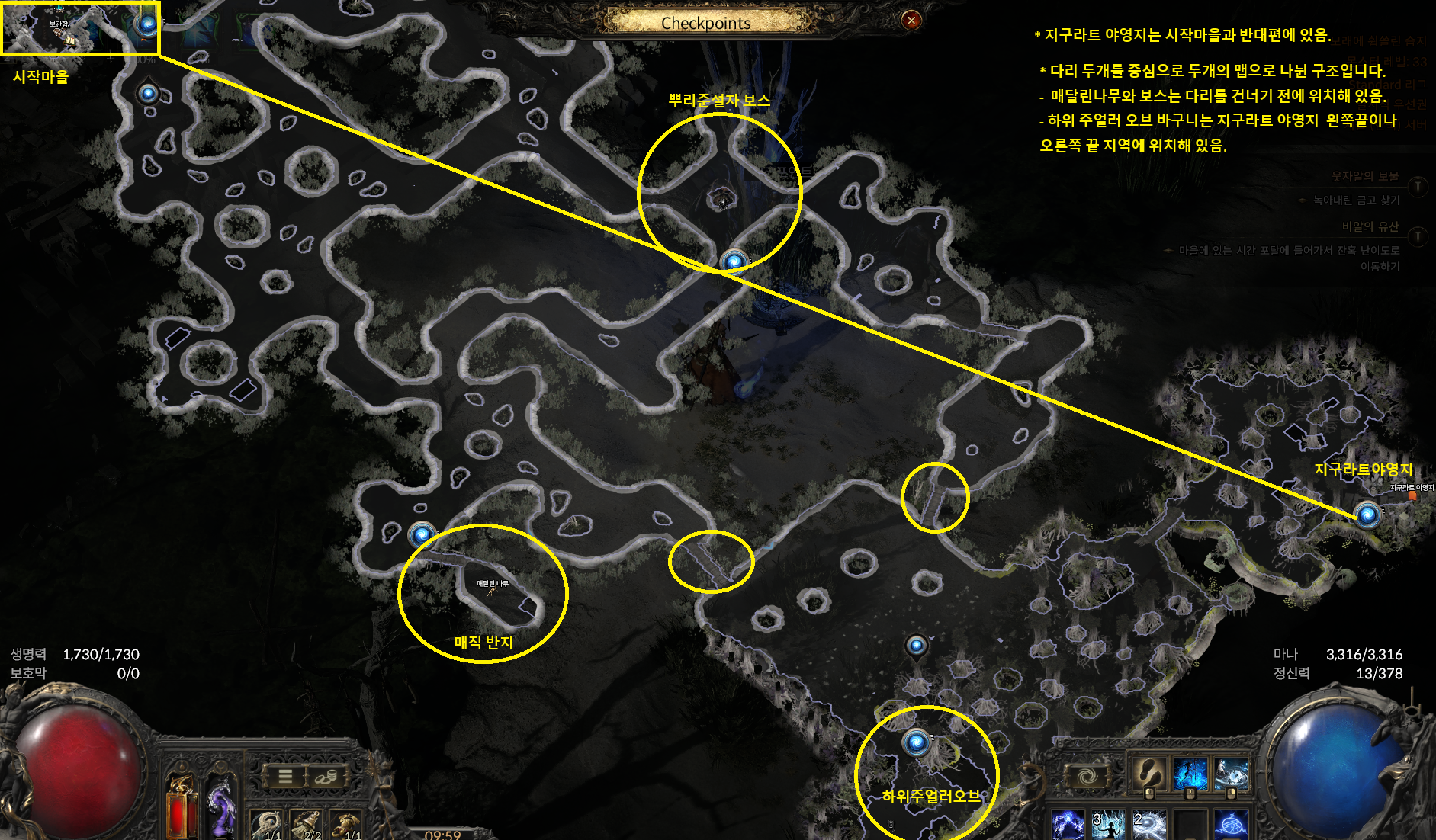 : 지구라트 야영지만 찾아갈 목적이라면, 반대방향으로 가면되고, 맨땅 스타터인경우, 스킬젬, 반지, 하위 주얼러 오브 등을 얻으려면, 맵을 많이 돌아다녀야 합니다.