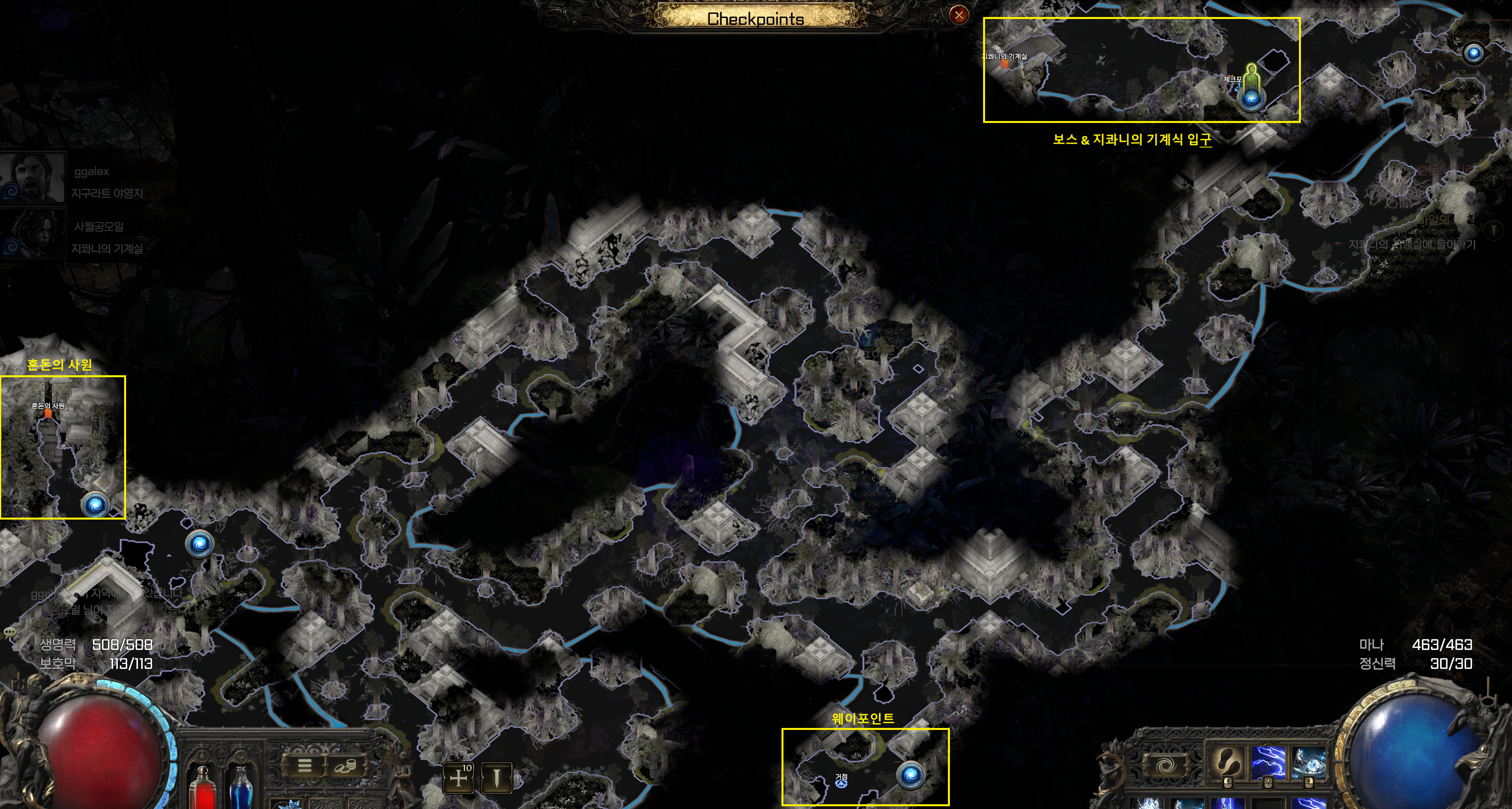 아자크 습지대나, 키메랄 습지대를 찾은 경우, 체크포인트를 활성화 한후, 들어가서 앞쪽에 있는 거점(웨이포인트)를 찍고 다시 들끓는 불모지로 들어와서 나머지 지역들도 찾아 웨이 포인트를 모두 확보하는 것이 좋습니다. 혹시 튕기거나 다른 지역을 진행하는데 시간이 오래 걸리면, 들끓는 불모지 맵이 초기화 되어, 길을 다시 찾아야 하는 경우가 있습니다.