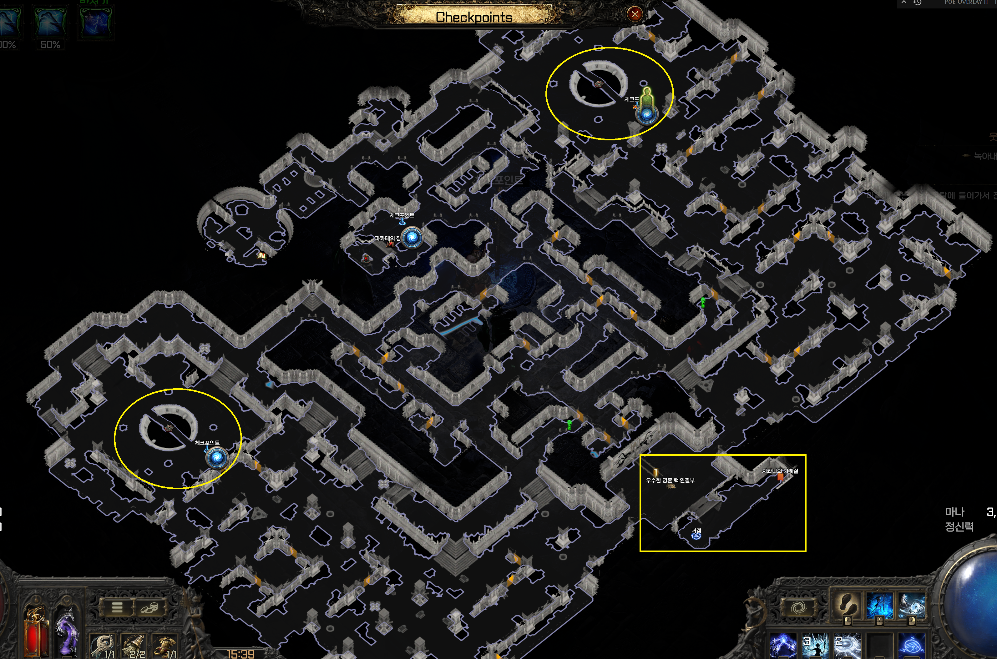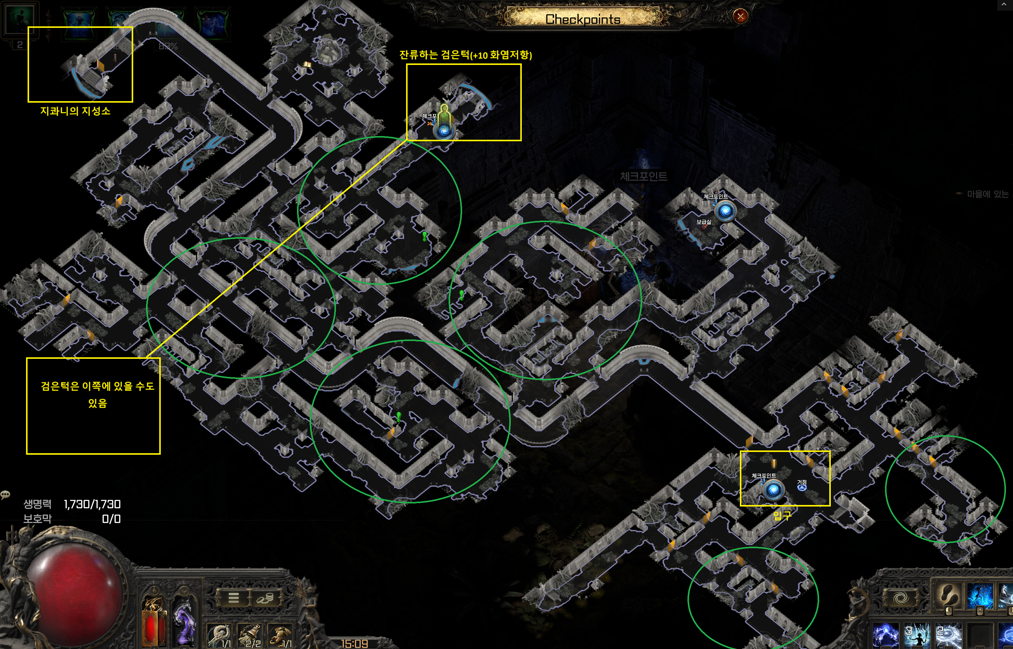 : 지콰니의 지성소는 발전기 2개를 찾아 중간 영혼핵을 올리면 다시 입구쪽으로 돌아와 보스 지코아틀을 처치하는 곳입니다. 발전기의 위치는 아래 맵을 참고하시면 됩니다. 문제는 중간 영혼핵인데, 위치가 랜덤이라, 멀리에 생성 될 수도 있습니다. 체크포인트 재소환을 통해서 발전기 근처에 중간 영혼핵이 위치하도록 하는 방법이 있습니다. 유튜브 영상을 참고하시면 되겠습니다.