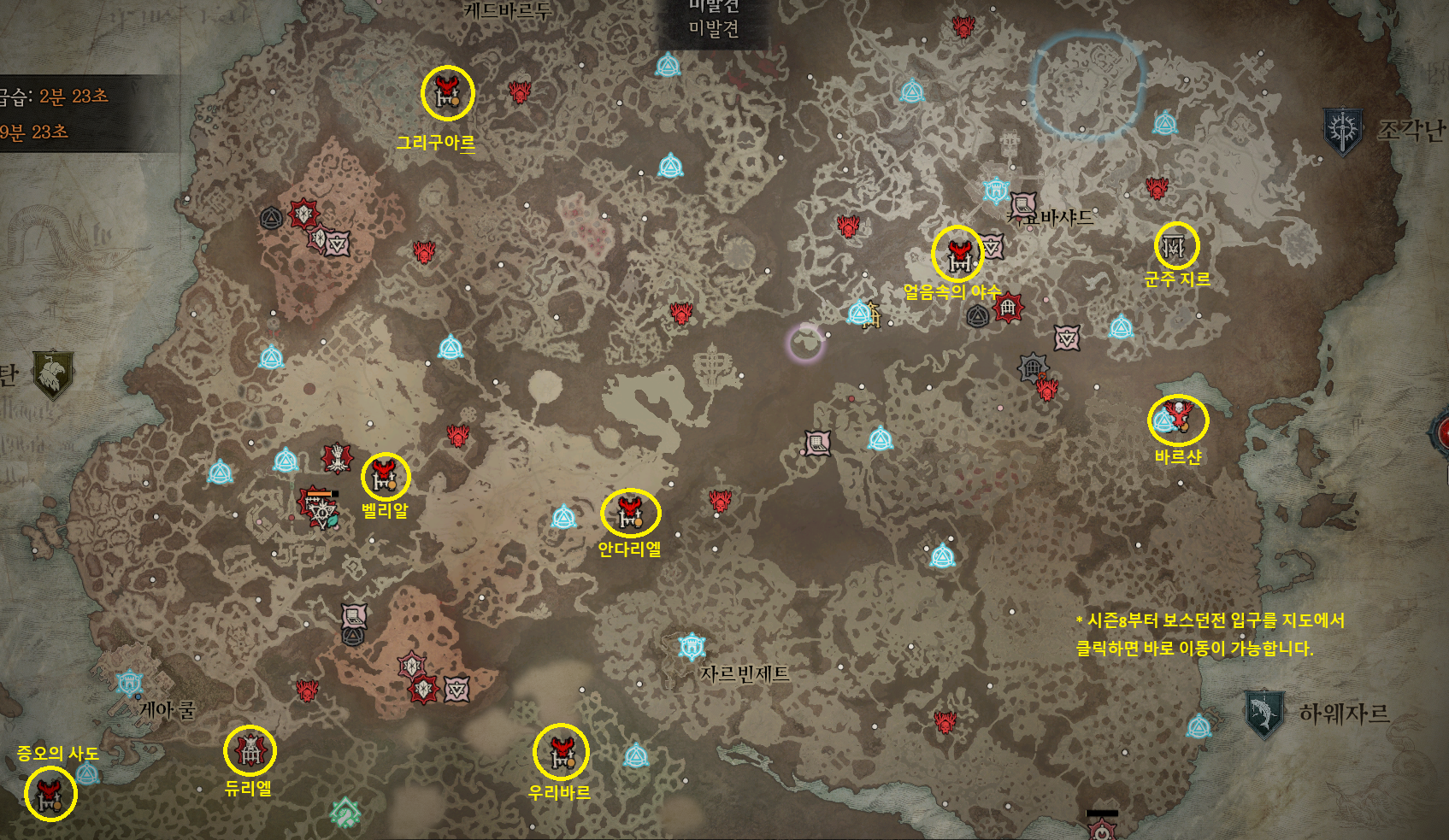 - 보스별 던전 위치 정보 지도. (시즌8부터 지도에서 보스던전 입구를 클릭하면 바로 이동이 가능합니다.)