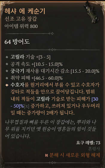| 야만용사 | 선조의 맹세, 지옥망치, 걸신들린 자의 반지, 산의 분노의 어깨걸이. 산신의 발굽. |