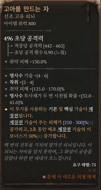 : 혼돈 아이템의 고유 옵션은 원래 버전보다 강력하며, 접두사 범위가 없는 대신 항상 가능한 가장 높은 값이 부여됩니다.