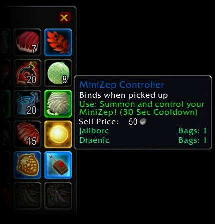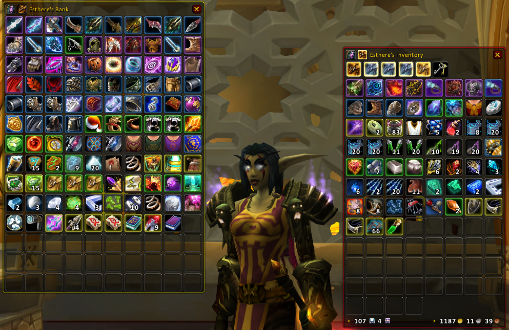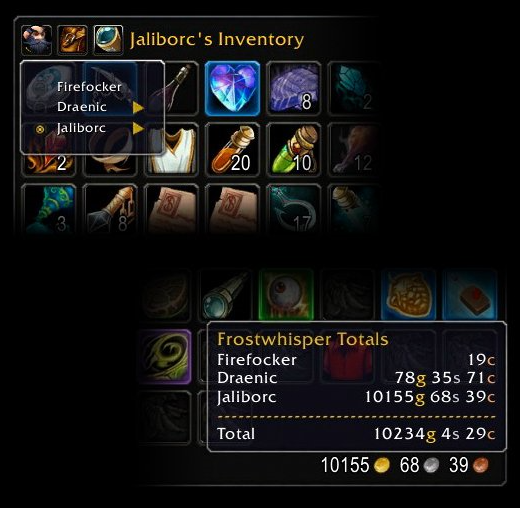- Bagnon : 가장 많이 사용되었던 통합가방 관련 애드온입니다. 가방을 하나로 합쳐서 보여줍니다. 케릭터별로 보유아이템및 보유갯수, 골드를 확인할 수 있습니다. (인벤토리와 은행, 길드은행 모두 지원)