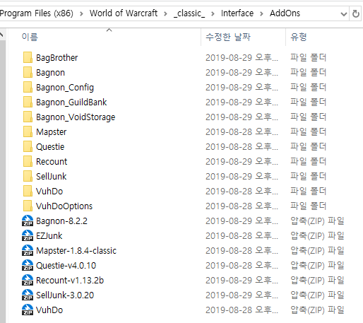 필요한 애드온들을 이런식으로 압축을 풀어서 넣어주시면 됩니다.